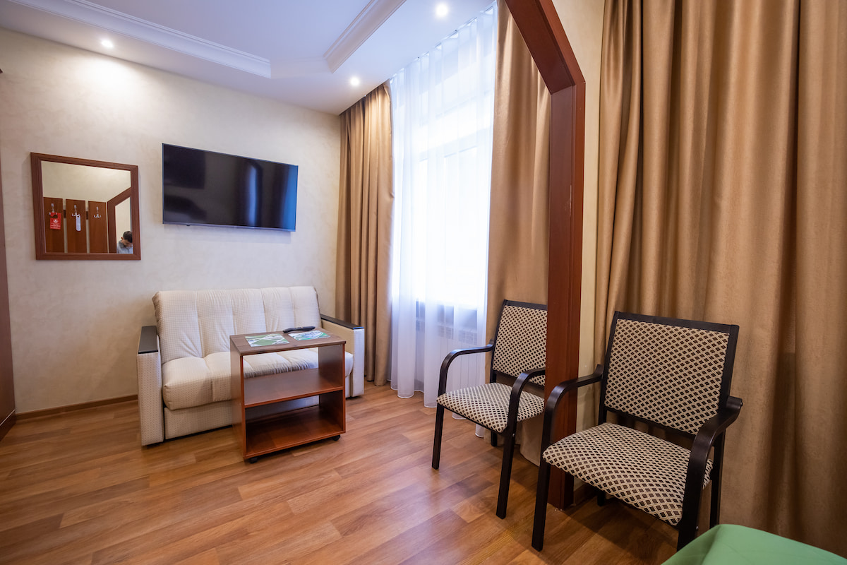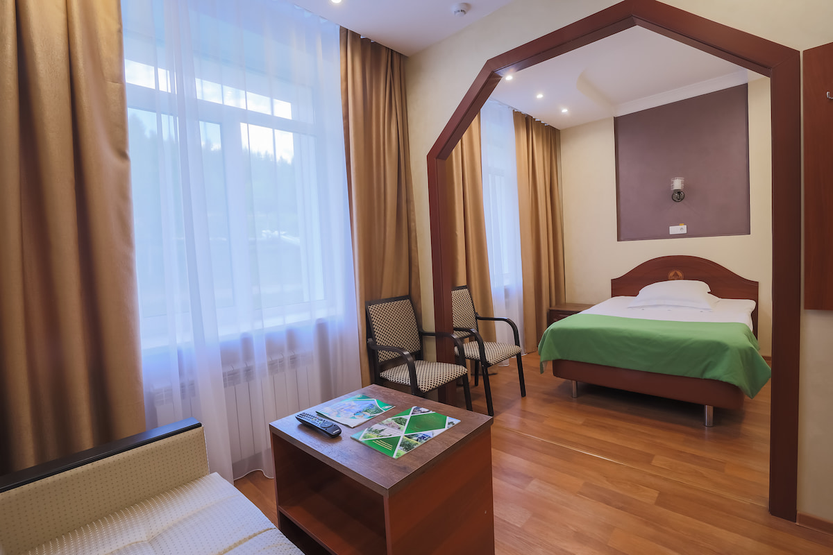 1 осн. место. Мебель: зеркало, кровать односпальная, стол, стул, шкаф. Оборудование: мини-холодильник, телевизор ЖК, чайный набор посуды, электрочайник. Санузел: с ванной или душевой кабиной, тапочки, туалетные принадлежности, халат. Сервис: Wi-Fi бесплатно, смена полотенец, смена постельного белья, уборка номера.