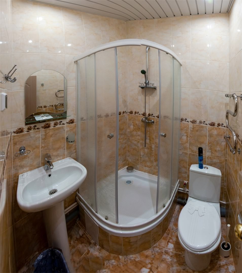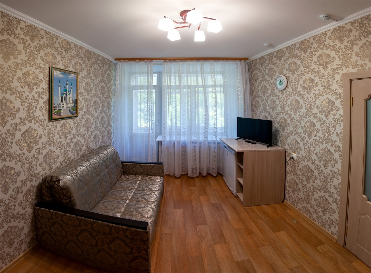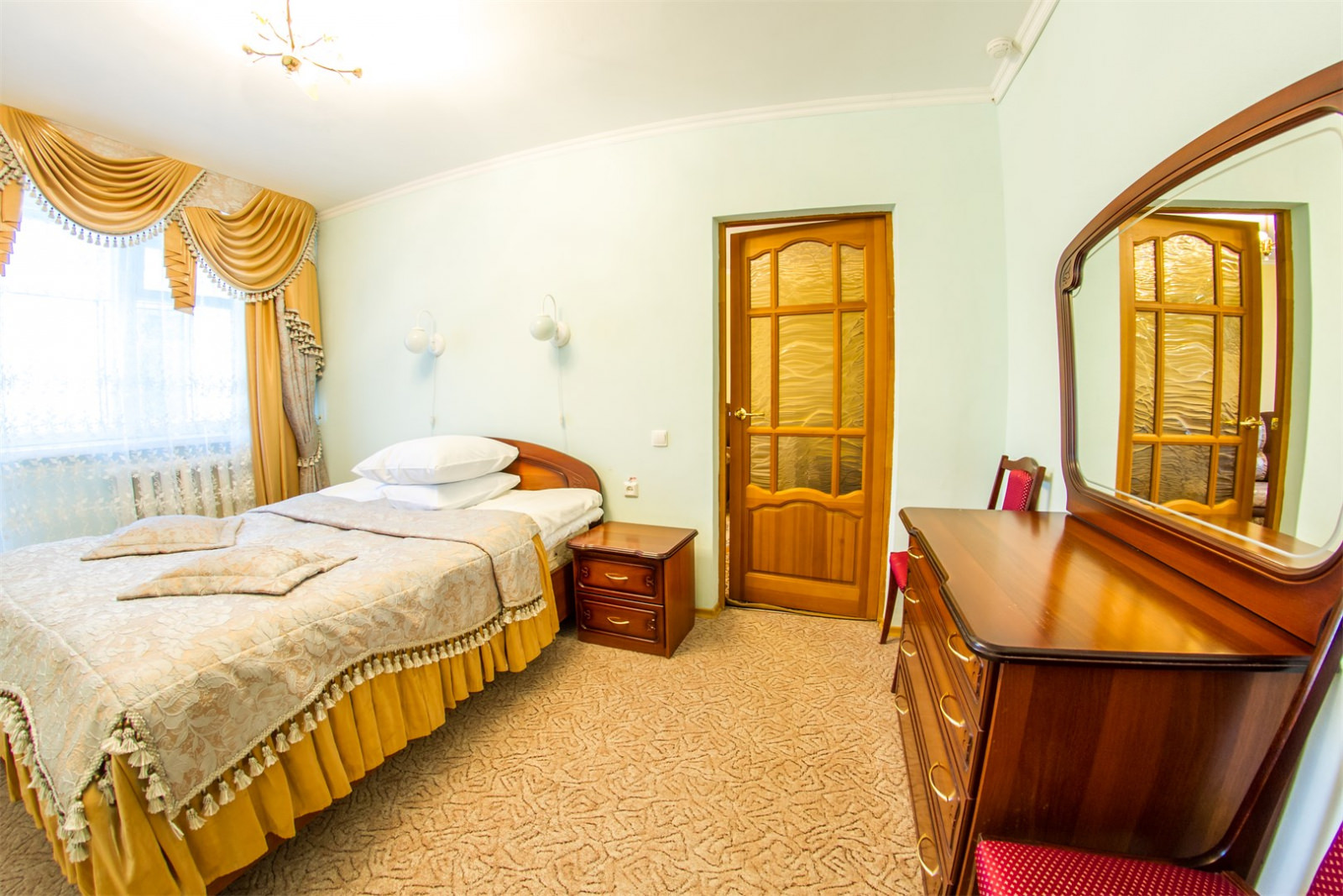 2 осн. места. 1 доп. место. Мебель: диван, зеркало, комод, кровать двуспальная (2), прикроватные тумбочки, стулья, тумба под телевизор. Оборудование: набор посуды, телевизор ЖК, холодильник, электрочайник. Санузел: с душевой кабиной, тапочки, туалетные принадлежности, фен, халат. Сервис: Wi-Fi бесплатно, смена полотенец, смена постельного белья, уборка номера.