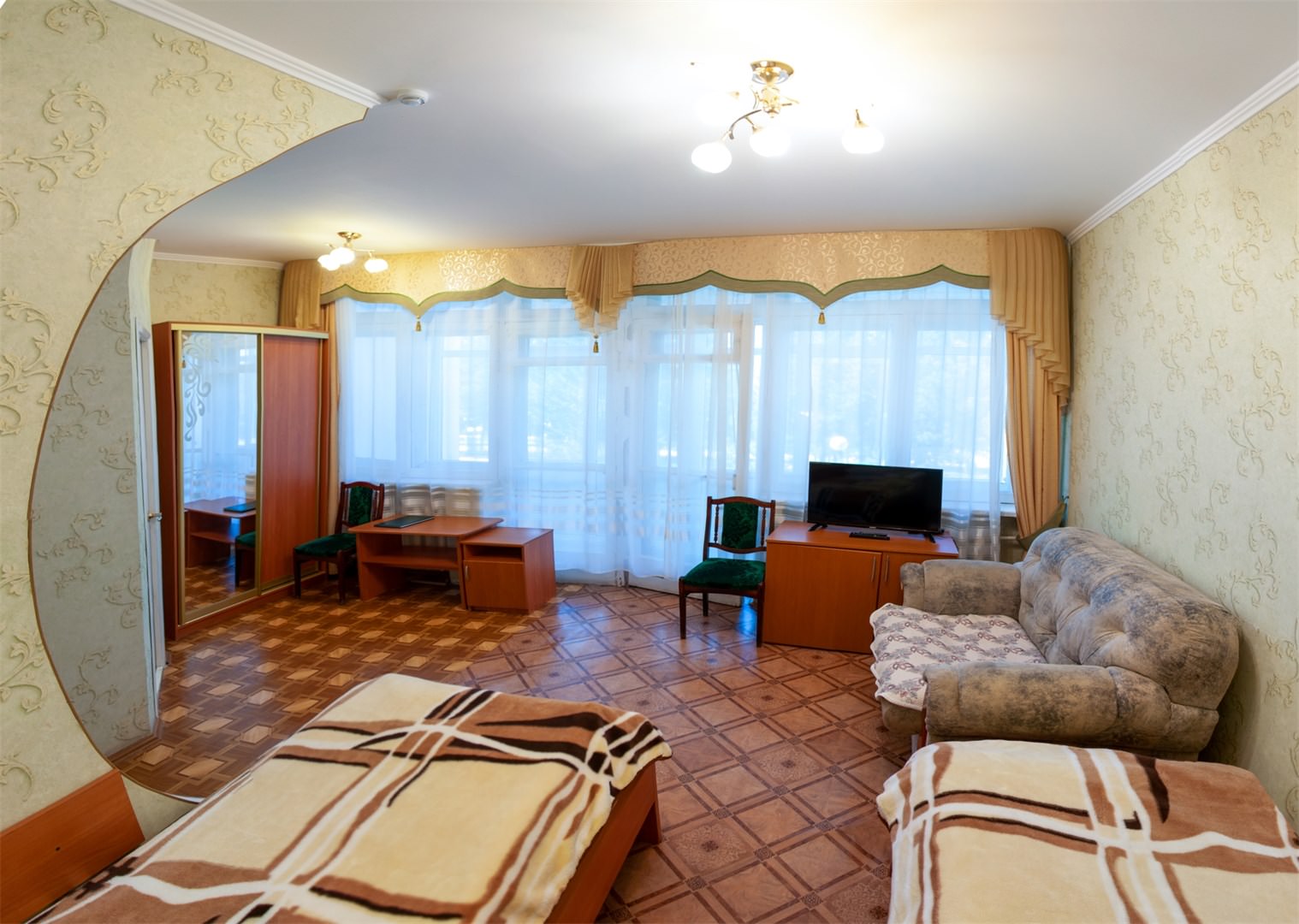 2 осн. места. 1 доп. место. Мебель: вешалка, диван, зеркало, кровати односпальные (2), столик журнальный, стулья, тумба под телевизор. Оборудование: телевизор ЖК, холодильник. Санузел: с душевой кабиной, туалетные принадлежности. Сервис: смена полотенец, смена постельного белья, уборка номера.