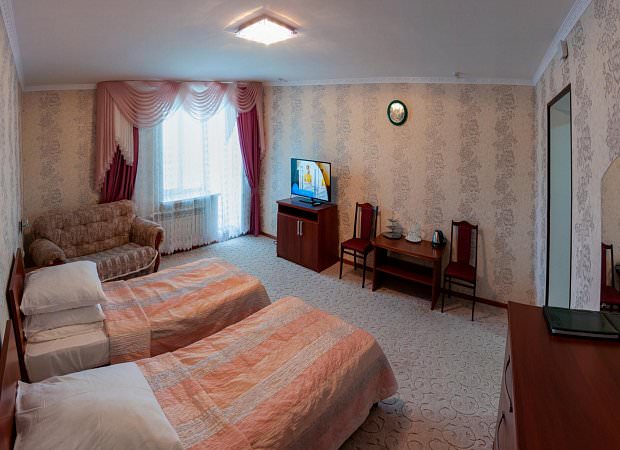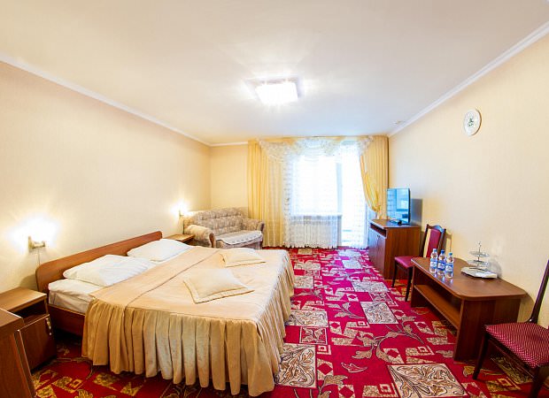 2 осн. места. 1 доп. место. Балкон. Мебель: диван, зеркало, комод, кровати односпальные /одна двуспальная кровать, прикроватные тумбочки, стол, стулья, шкаф. Оборудование: телевизор ЖК, холодильник, чайный набор посуды, электрочайник. Санузел: с душевой кабиной, тапочки, туалетные принадлежности, фен, халат. Сервис: Wi-Fi бесплатно, смена полотенец, смена постельного белья, уборка номера.