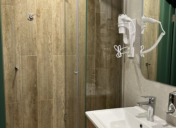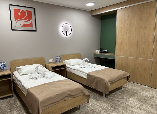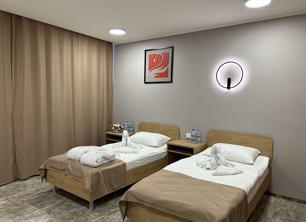 2 осн. места. Балкон. Мебель: зеркало, кровати односпальные, прикроватные тумбочки, стол, стулья, шкаф. Оборудование: мини-холодильник, телевизор ЖК, чайный набор посуды, электрочайник. Санузел: с душем, тапочки, туалетные принадлежности, фен, халат. Сервис: Wi-Fi бесплатно, смена полотенец, смена постельного белья, уборка номера.