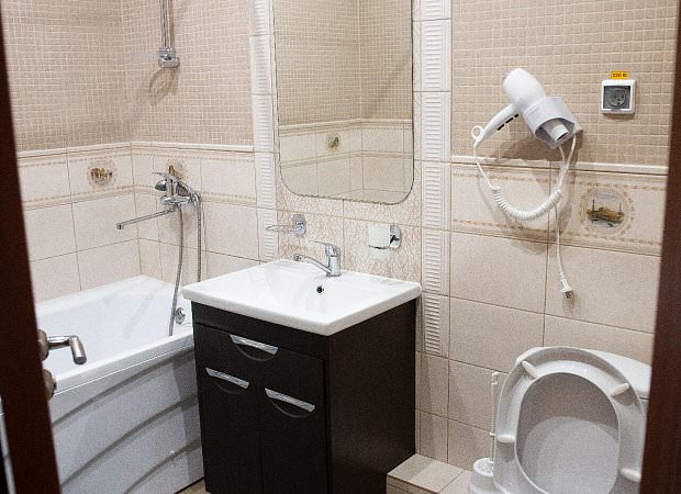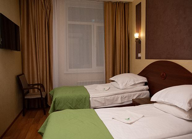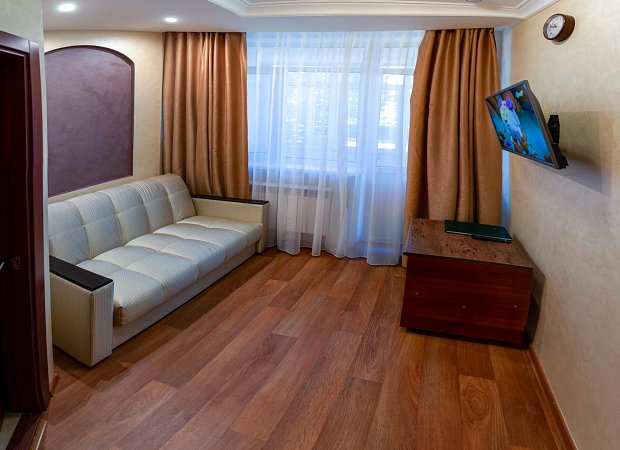 2 осн. места. 1 доп. место. Балкон. Мебель: диван, зеркало, кровати односпальные (2), стол, стулья, шкаф. Оборудование: телевизор ЖК, холодильник, чайный набор посуды, электрочайник. Санузел: с ванной или душевой кабиной, тапочки, туалетные принадлежности, фен, халат. Сервис: Wi-Fi бесплатно, смена полотенец, смена постельного белья, уборка номера.
